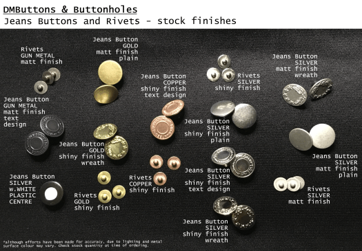 We provide a machine application service for standard-sized jeans buttons and nipple cap rivets, available in a variety of metal finishes, including: